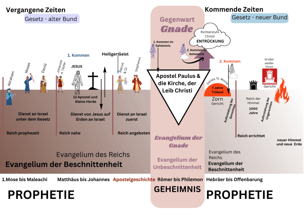 Aus meiner Sicht ist der Aufbau der Bibel in drei große Zeitabschnitte gegliedert. Ganz vereinfacht dargestellt verhält es sich so: Von Mose bis zur Apostelgeschichte zeigt uns Gott, was in vergangenen Zeiten geschah. Die 13 Paulusbriefe (Römer bis Philemon) liefern uns alle Informationen über das „Heute“, also die gegenwärtige Heilsverwaltung, in welcher wir uns momentan befinden. Ab dem Hebräerbrief bis zur Johannesoffenbarung gibt Gott dem Volk Israel die Anweisungen für die zukünftige Trübsalszeit und ihren Rettungsweg, um ins Reich der Himmel eingehen zu können.