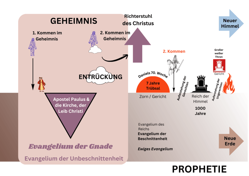Da Geheimnis und Prophetie sich gegenseitig daran hindern, ihren Lauf zu nehmen und da der Beginn unserer Heilsverwaltung der Gnade außerhalb der prophetischen Linie lag, schlussfolgere ich, dass ihr Ende genauso Teil des Geheimnisses ist, wie es schon ihr Anfang war. Das geheime Kommen des Christus, mit welchem er unsere Gemeinde startete und Sein himmlisches Amt am Apostel Paulus aufnahm ist für mich die Blaupause, wie unsere Zeitalter geschlossen werden wird.